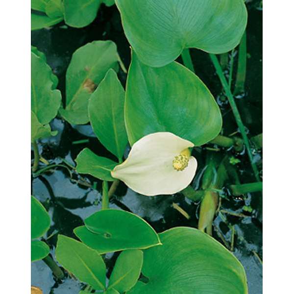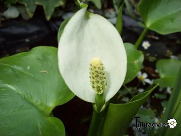 De slangenwortel groeit evengoed langs de oever als in het water en is dus ideaal om de vijverranden te verstoppen.