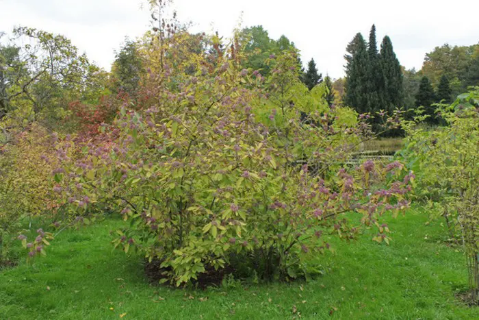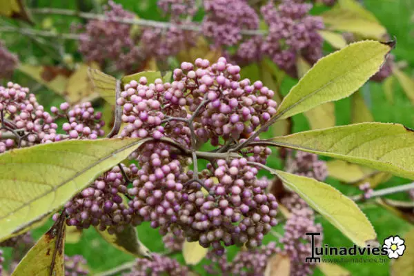 Bloeit in de zomer met kleine, rozewitte bloemen gevolgd door paarsroze bessen in Oktober/november.