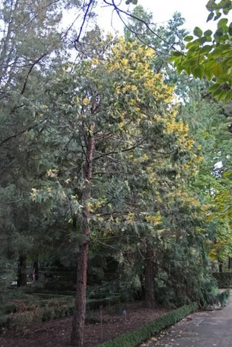 De boom draagt afhangende ovale kegels.