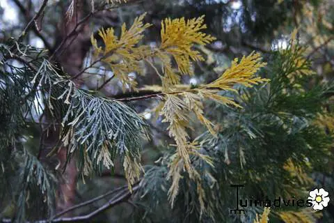 Calocedrus decurrens 'Aureovariegata' is zuilvormig.