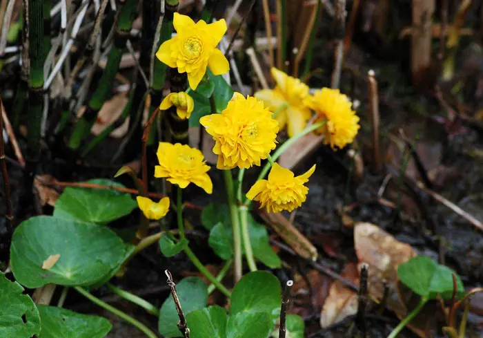Men vind deze inheemse Caltha palustris 'Plena' vaak langs sloten, beken en vochtige weiden.