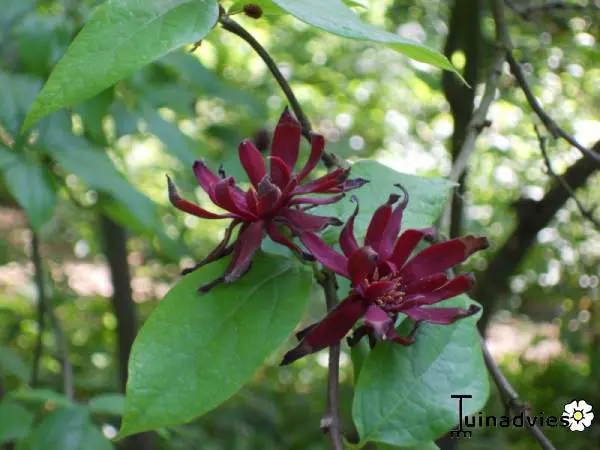 -Calycanthus floridus bloeit uitbundiger maar de bloemen zijn dan meer bruinrood van kleur.