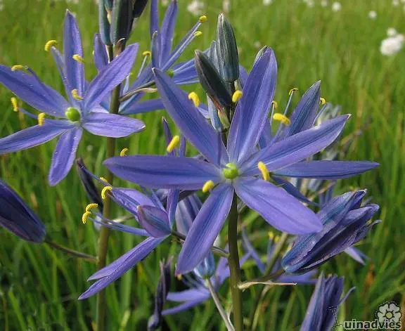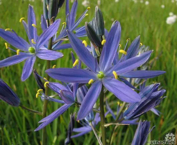 Camassia quamash is een snelgroeiende, meerjarige bolgewas met hoge bloemstengels bezet met stervormige helderblauwe bloemen met gele meeldraden.