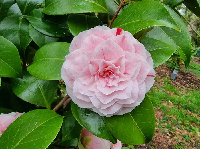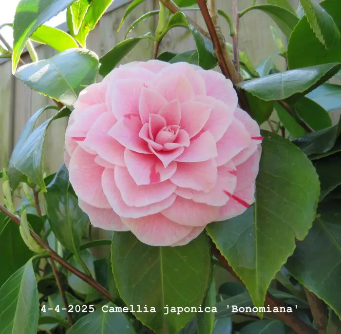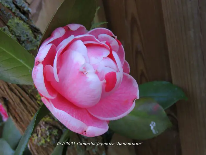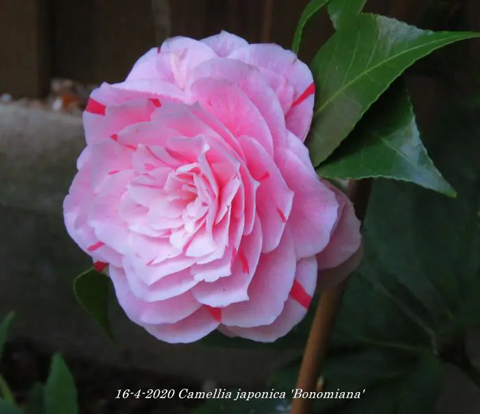 Camellia japonica 'Bonomiana' heeft grote gevulde bloemen, wit/roze met karmijnrode strepen.
