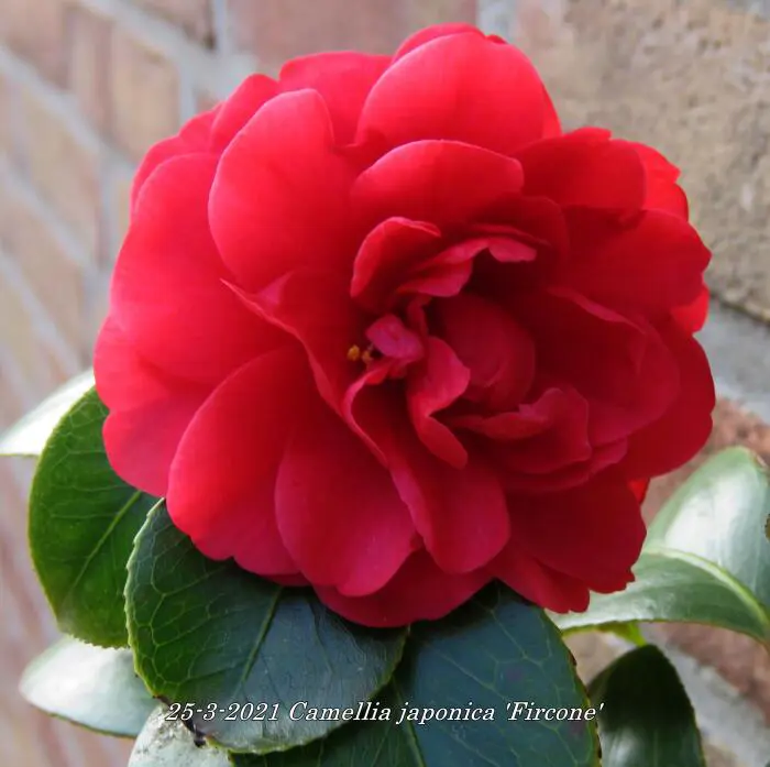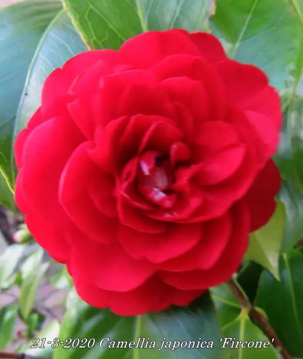 Camellia japonica 'Fircone' bloeit met roosvormige bloedrode bloemen.