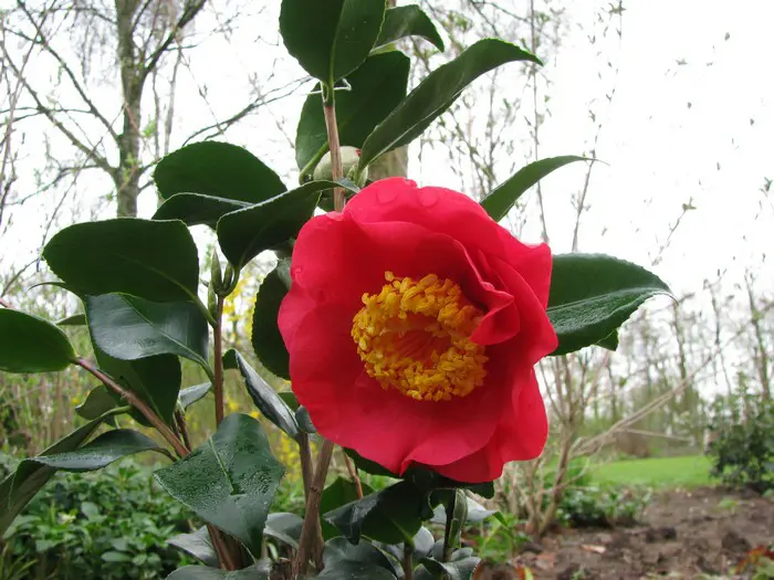 Camellia japonica 'R.L. Wheeler' bloeit met halfdubbele anemoonvormige roze tot karmijnrode bloemen met in het centrum goudgele meeldraden.