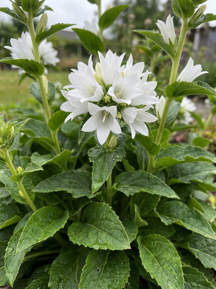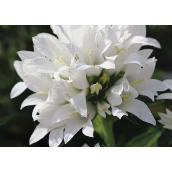 Campanula glomerata 'Alba' bloeit met trossen van mooie witte bloemen in de vorm van open klokken, bovenaan de stengels.