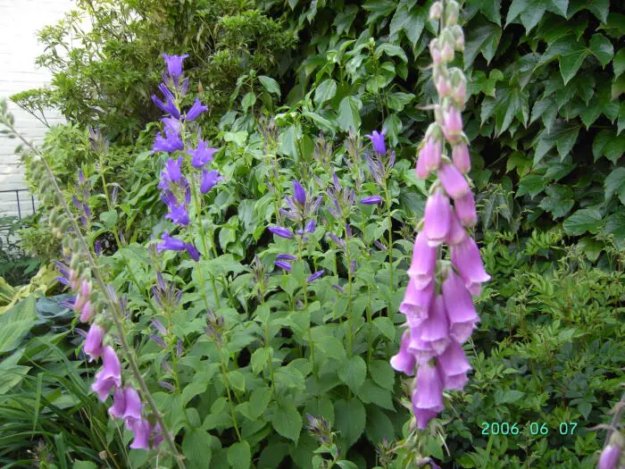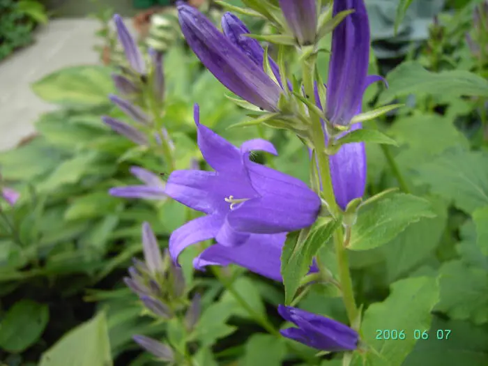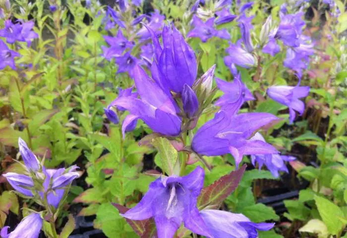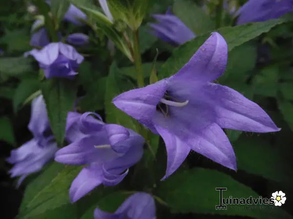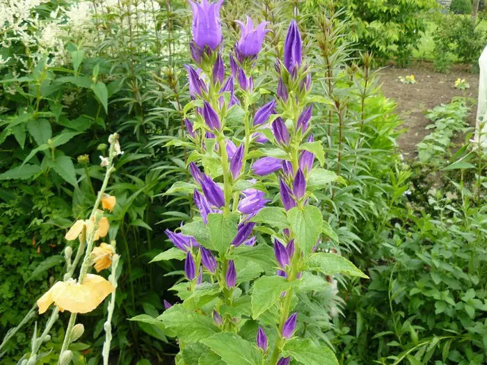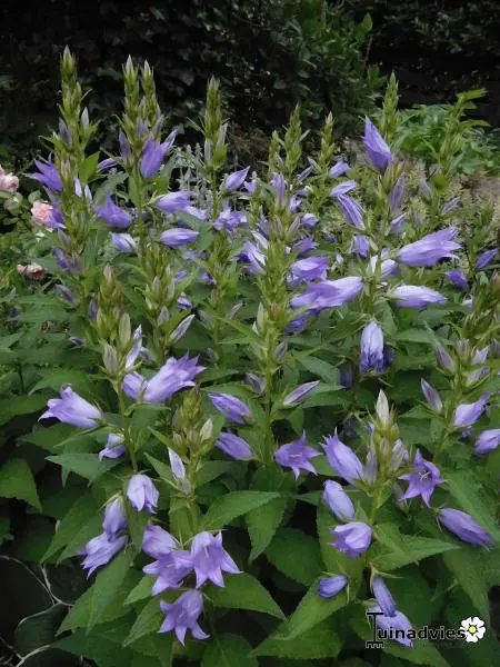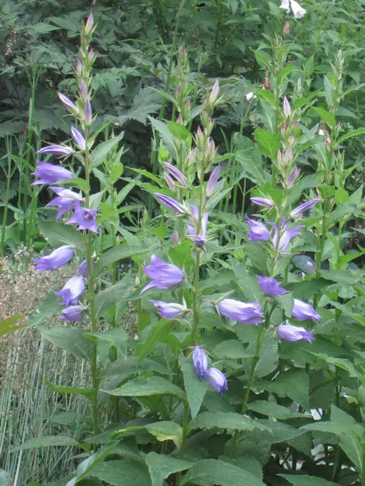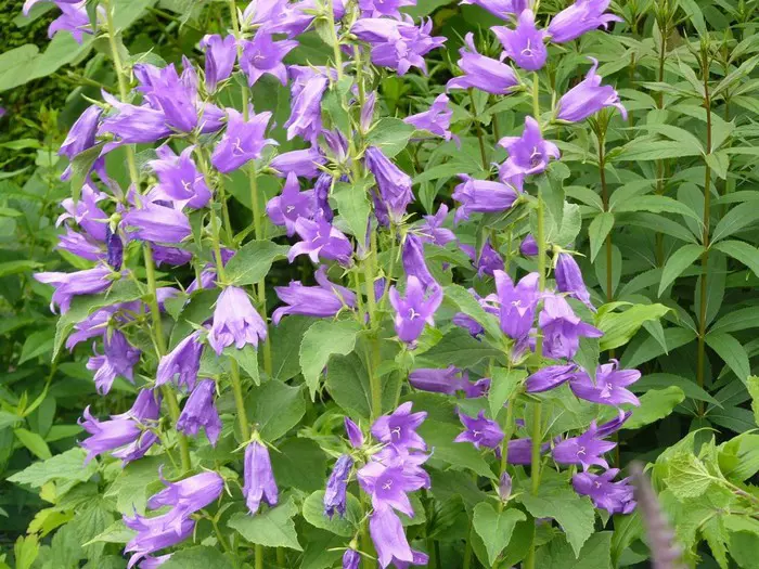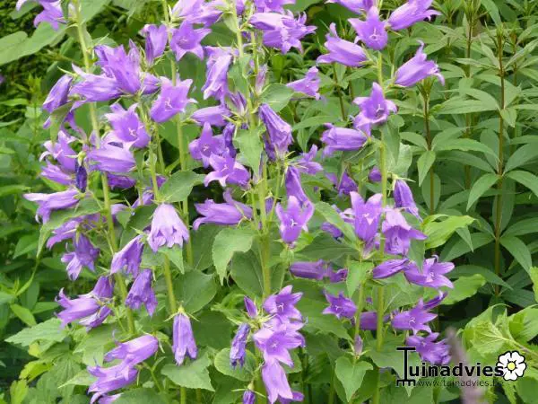 Campanula latifolia var. macrantha bloeit met talrijke paarsblauwe klokjesbloemen op stevige stengels.