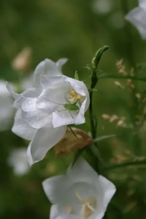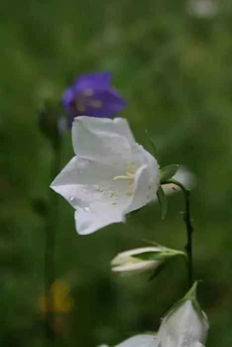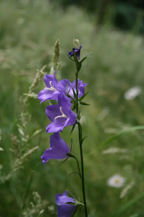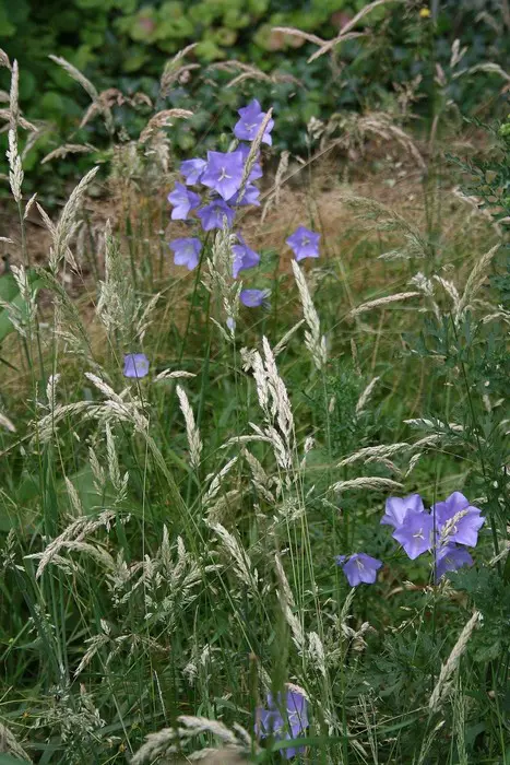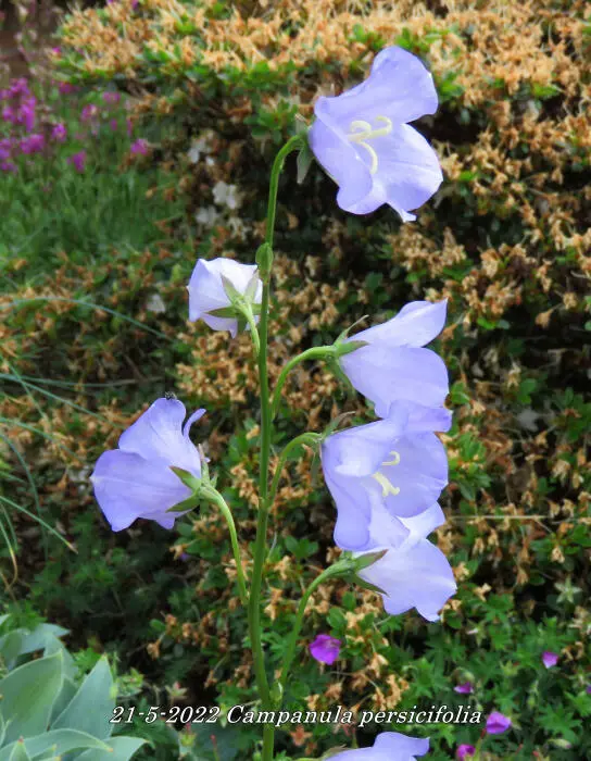 Campanula persicifolia bloeit aan hoge kale stengel met grote, zeer zachte paarsblauwe klokjesbloemen in de zomer, die ver boven een dicht kussen van bladeren uitsteken.