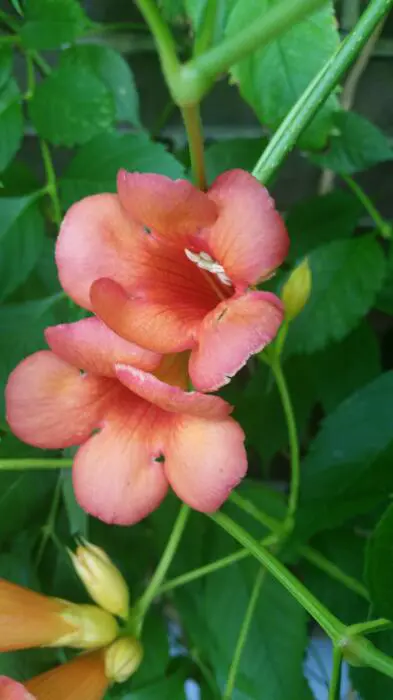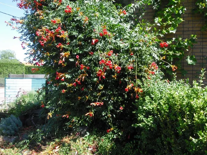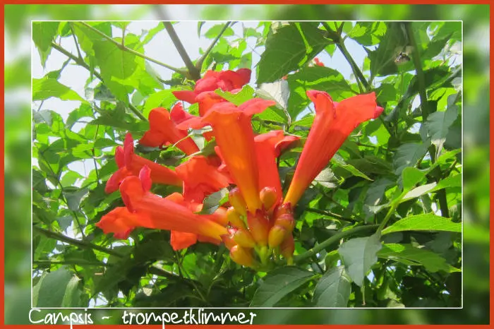 Campsis radicans is een rijkbloeiende zelf hechtende klimmer met trompetachtige oranjerode bloemen.