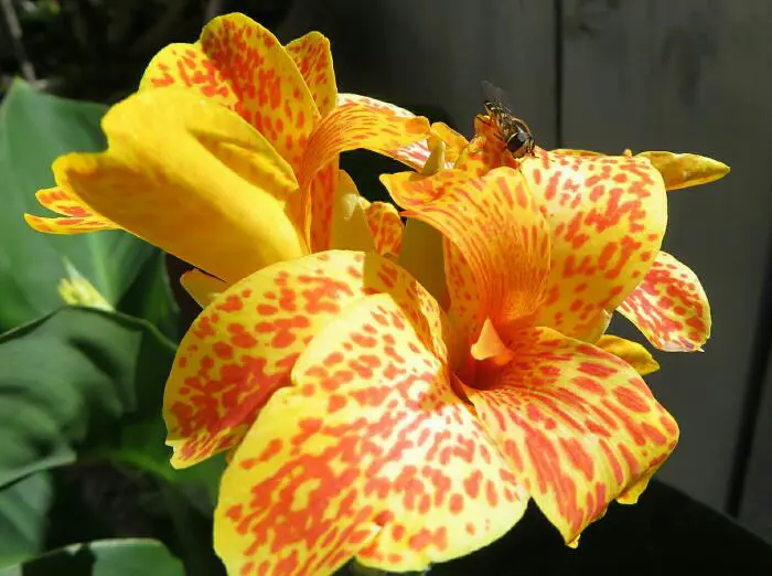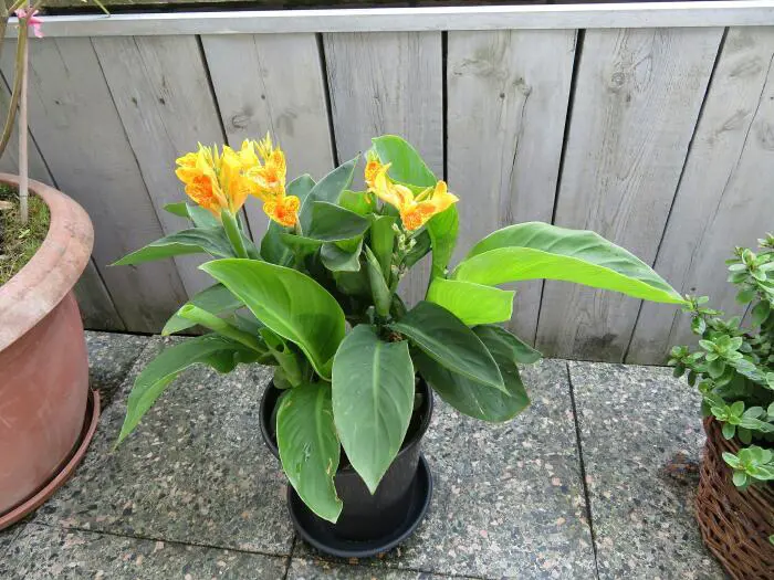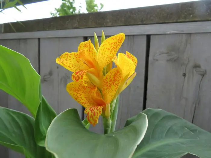 Canna lutea komt oorspronkelijk voor in Z-Amerika, bloeit van juli tot de eerste vorst met gladioolachtige gele bloemen met oranje vlekjes .