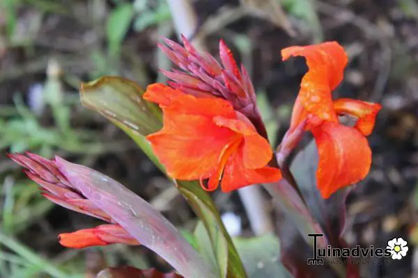 Canna 'Tali' bloeit met gladioolachtige, oranje gevlamde rode bloemen.