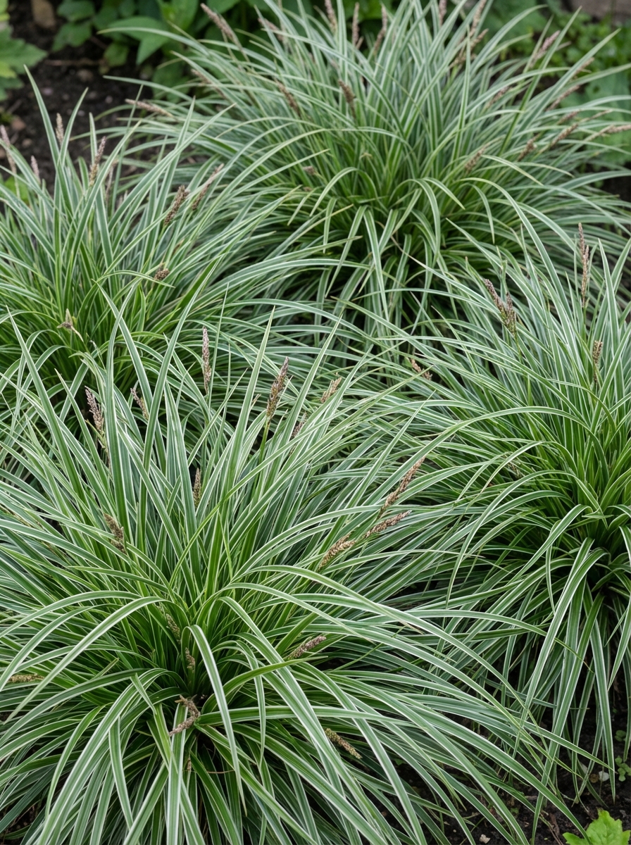 Carex conica 'Snowline' vormt een pol van witgestreepte donkergroene bladeren.