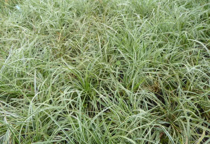 Carex conica 'Snowline' vormt een pol van witgestreepte donkergroene bladeren.