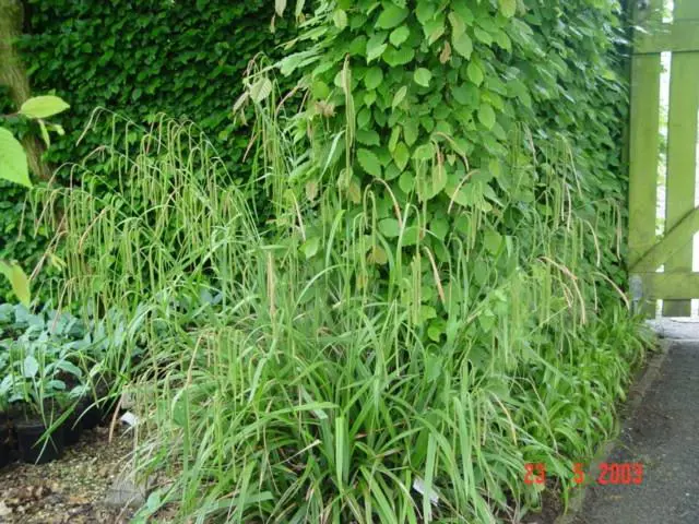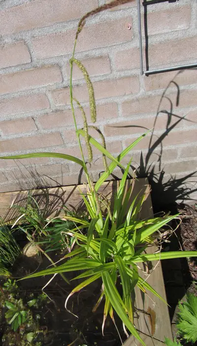 Een hoge Carex met opvallende hangende pluimachtige bloei.