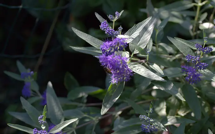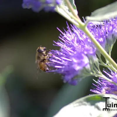 Bloeit met grote dichte trossen van donkerblauwe pluizige bloempjes met opvallend lange meeldraden.