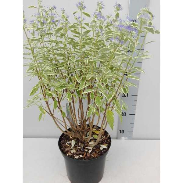 Caryopteris x clandonensis 'White Surprise' vormt een opgaande, bossige vertakte struik met lancetvormige, grijsgroene bladeren met een roomwitte rand, zilverviltig aan de onderkant. Bij het kneuzen van het blad komt er een muntgeur vrij.
