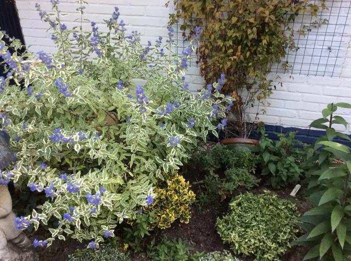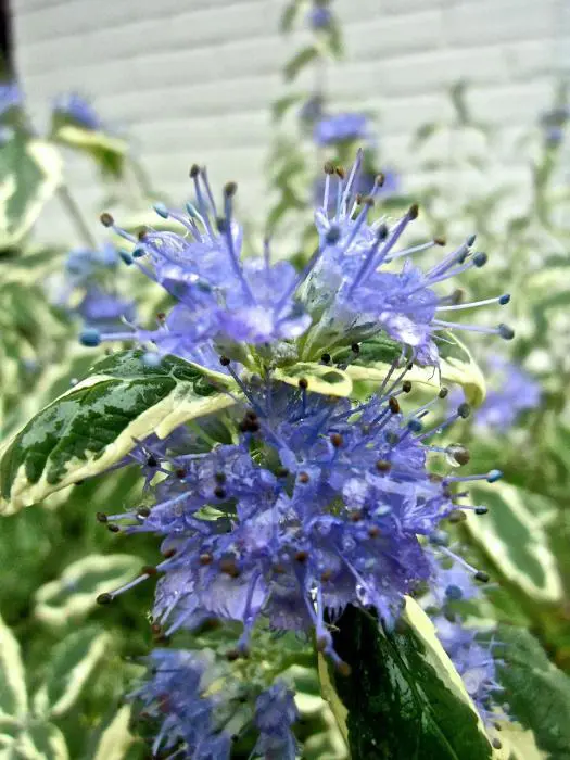 Bloeit met grote dichte trossen van helderblauwe pluizige bloempjes met opvallend lange meeldraden.