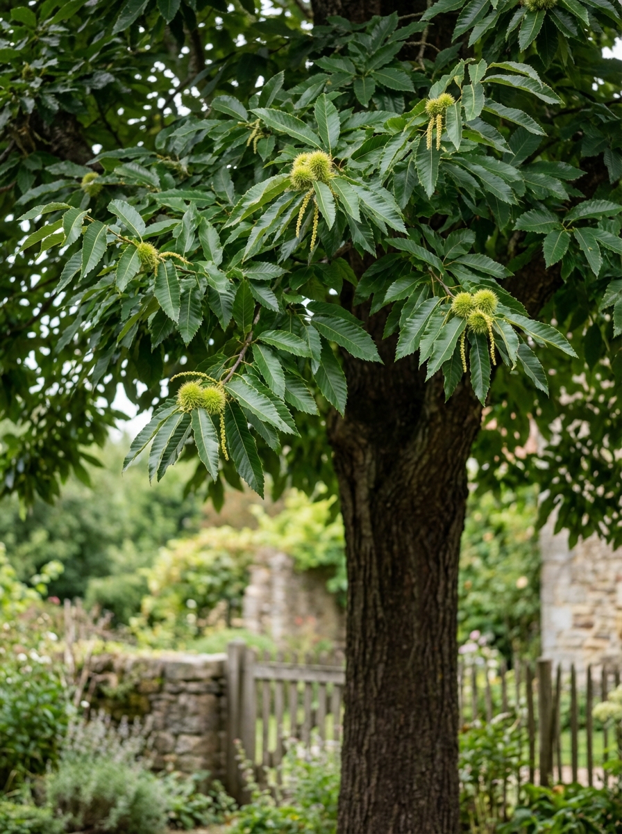 In de herfst komen de eetbare vruchten die in een stekelige bolster zitten.