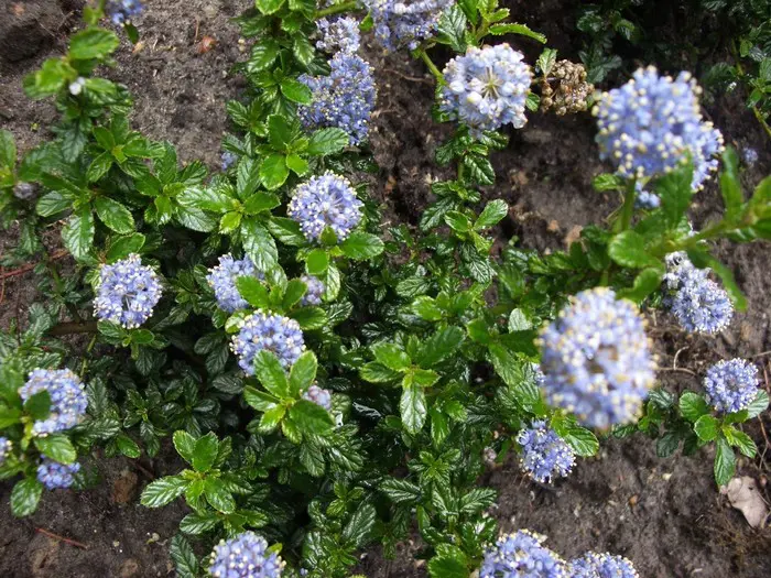Ceanothus repens 'Blue Mound' is een brede en compacte, rijkbloeiende struik met helder hemelsblauwe bloei in de lente en soms een lichte herbloei in het najaar.