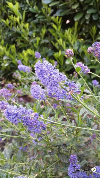Bloeit met tuilen van geurige, donkerblauwe bloemen die uit paarsrode knoppen bloeien.