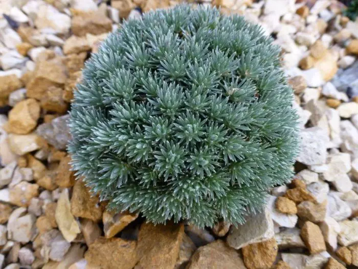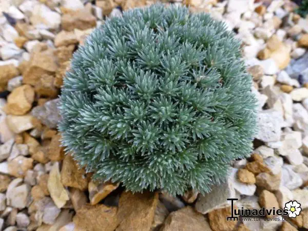 Het is een dicht vertakt halfheestertje. Vormt zilvergrijze kussentjes van korte lineaire dikke blaadjes en bloeit met witte margrietachtige bloemen.