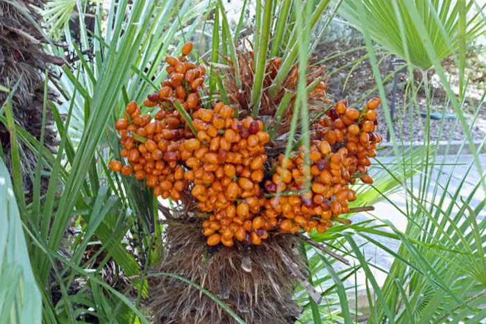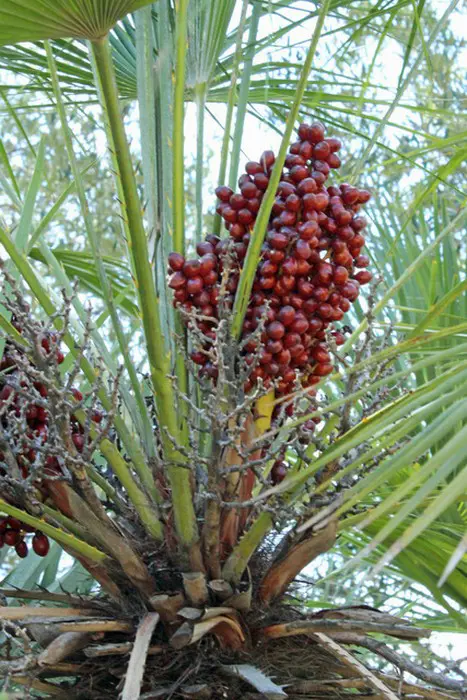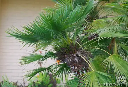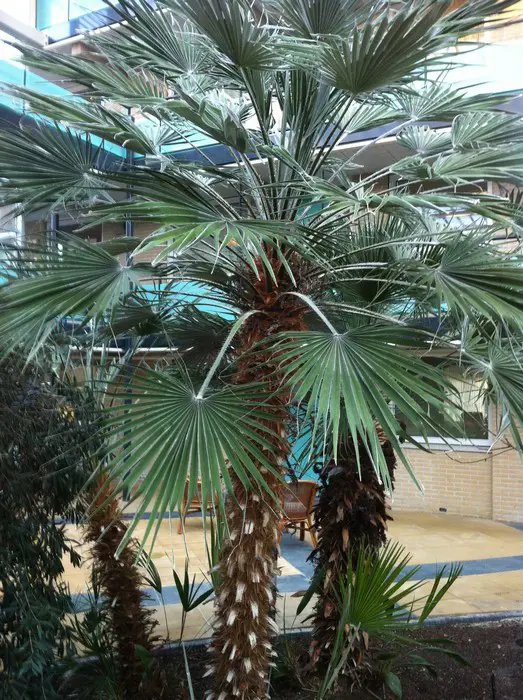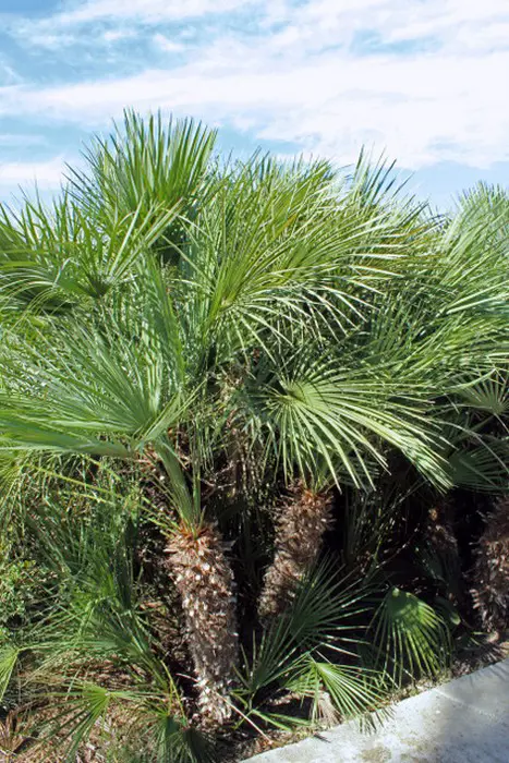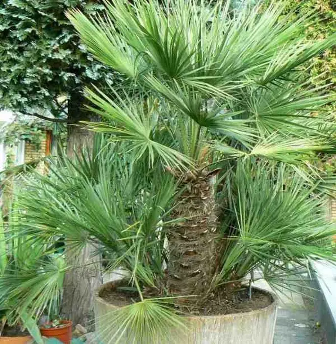 Chamaerops humilis heeft vlezige waaiervormige bladeren met in de lente gele bloei.