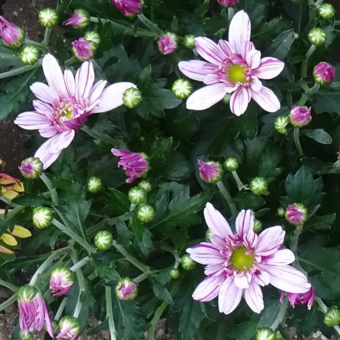 Chrysanthemum indicum 'Artistic Rosy' is een bossige plant met een overvloed aan lilaroze bloemen.
