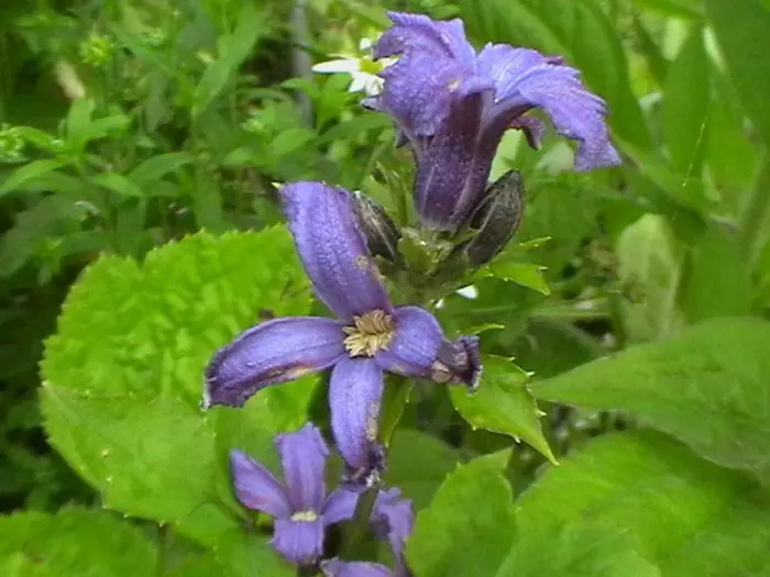 De paarsblauwe bloemen staan in trossen rondom de stengel, trompetvormig met 4 teruggeslagen bloemblaadjes.