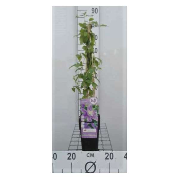 De laagblijvende Clematis viticella 'Justa' bloeit lilablauw met zachtgele meeldraden.
