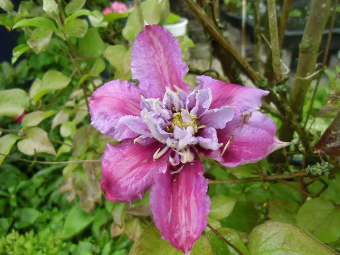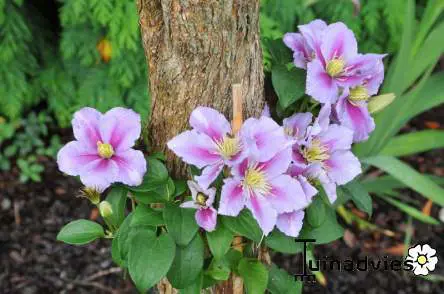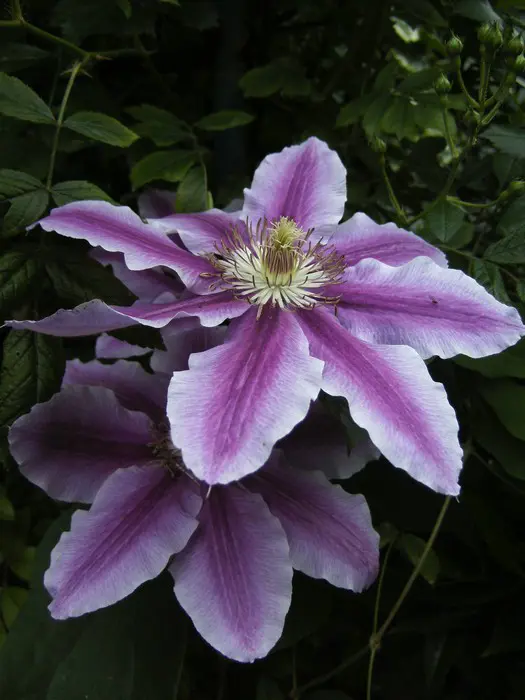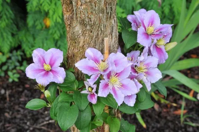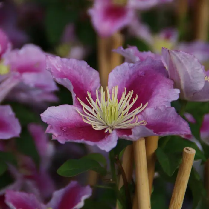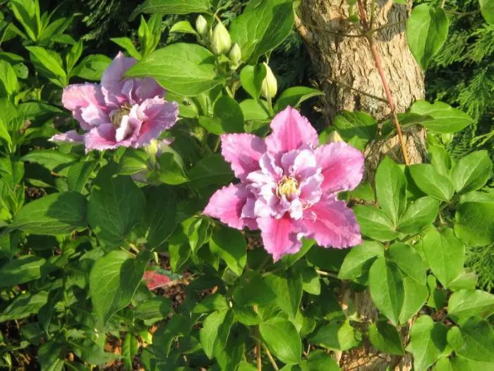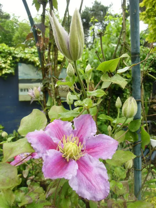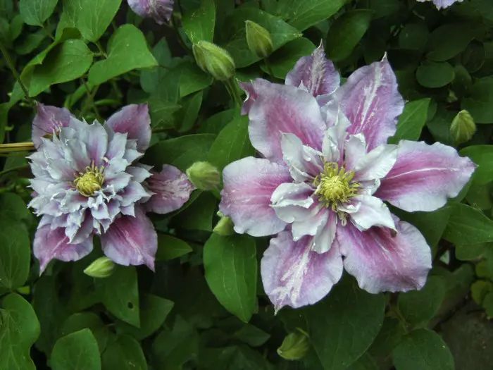 Het zijn vroege grootbloemige Clematissen die op het oude hout bloeien.