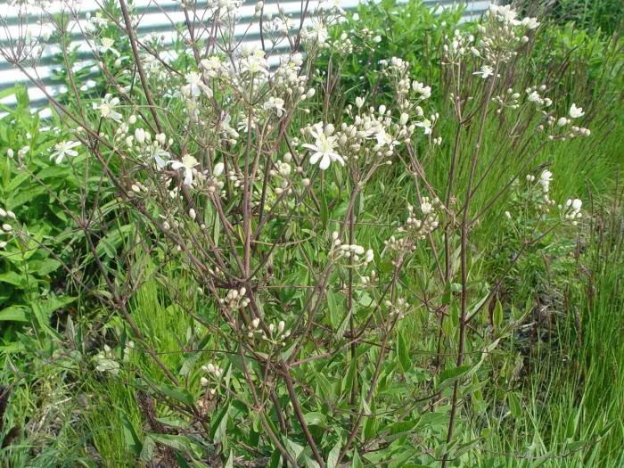 Clematis recta wordt 100cm hoog maar gaat vaak hangen met een massa witte bloemen en kan goed gebruikt worden in kleine heesters die als steun kunnen dienen.