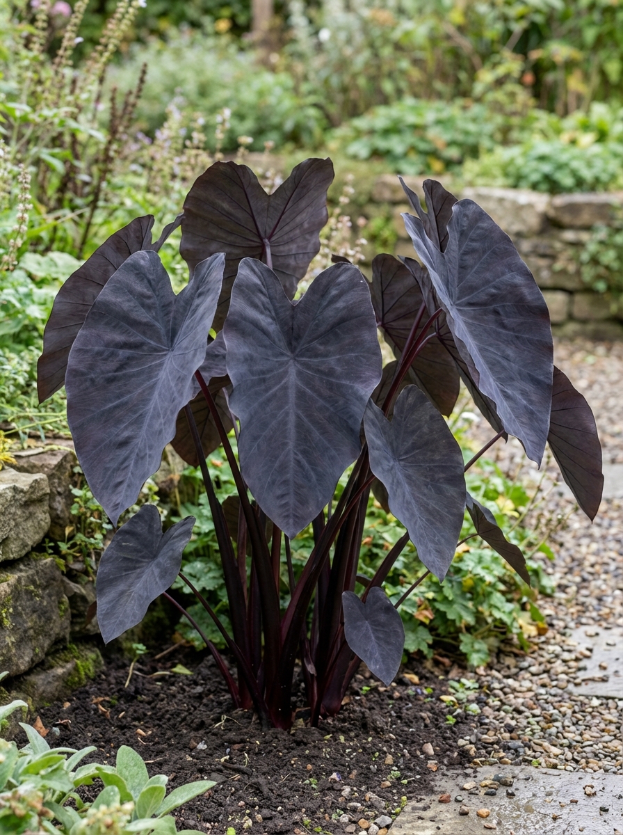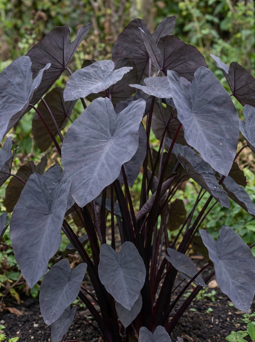 Colocasia esculenta 'Black Magic' is een tropische plant afkomstig uit Azië en blijft kleiner dan de meeste andere varianten.