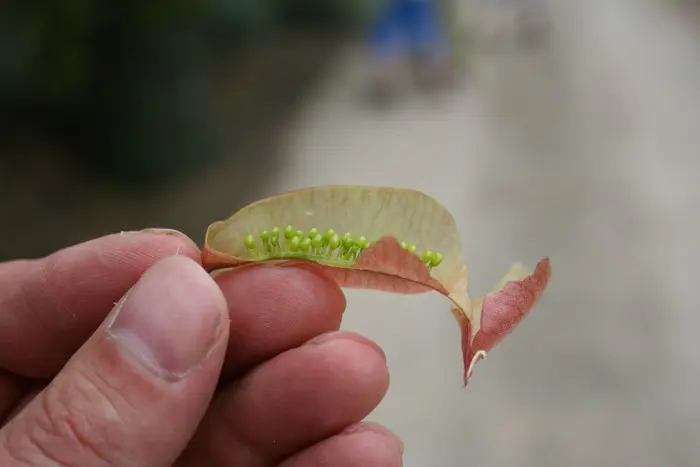 Naast de mooie bloemen en leuke vruchten heeft de plant ook nog prachtige geveerde bladeren.