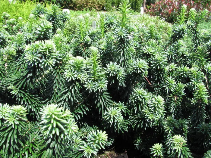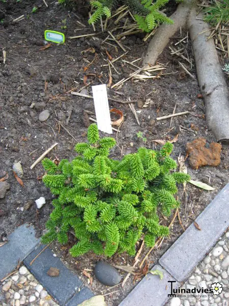Abies balsamea 'Piccolo' is een kogelvormig groen dwergconifeertje met roodbruine knoppen aan de takken.
