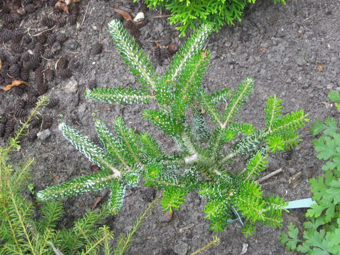 Abies koreana 'Silberlocke' is een kleine bossige conifeer met gekrulde naalden.