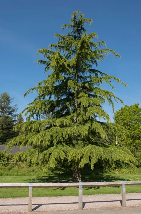 Cedrus deodara vormt een hoge smalle piramidale boom met donker blauwgroene naalden.