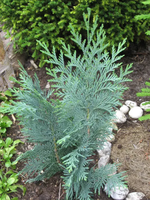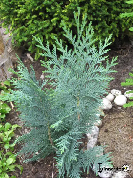 Chamaecyparis lawsoniana 'Alumii' is een kegelvormige conifeer met blauwgroene kleur.Kan gebruikt worden als haag maar verdraagt niet zo goed snoei.De kleur is intenser in de zon.