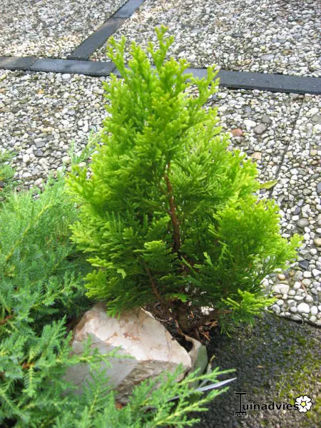 Chamaecyparis lawsoniana 'Minima Aurea' is een dwergvorm met een bossige kegelvormige groeiwijze en bijna verticaal opstaande takken. De naalden zijn eerst lichtgeel en worden later goudgeel tot geelgroen.