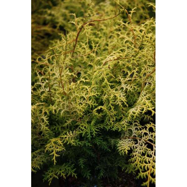 Chamaecyparis obtusa 'Lucas' is een mooie gele conifeer die in april bloeit gevolgd door kleine kegeltjes.