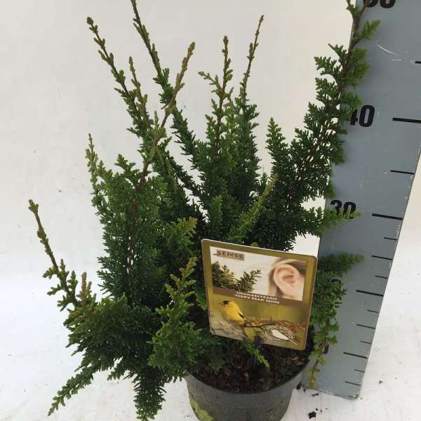Chamaecyparis obtusa 'Teddy Bear' is een laag brede conifeer die op het eerste zicht op een varen lijkt.