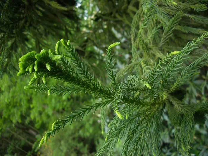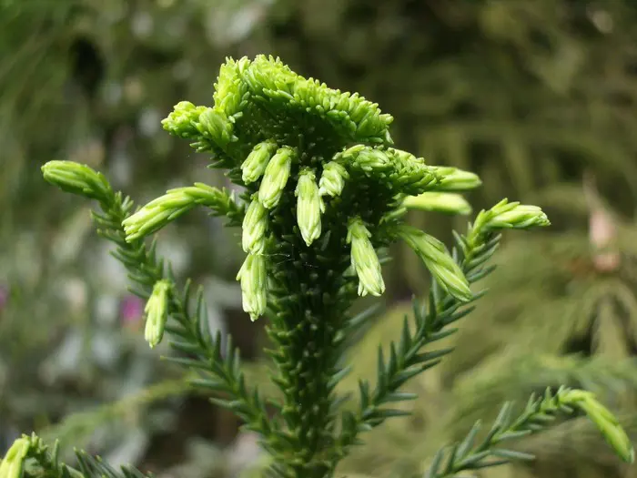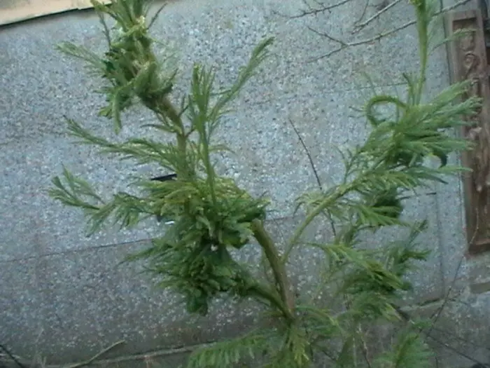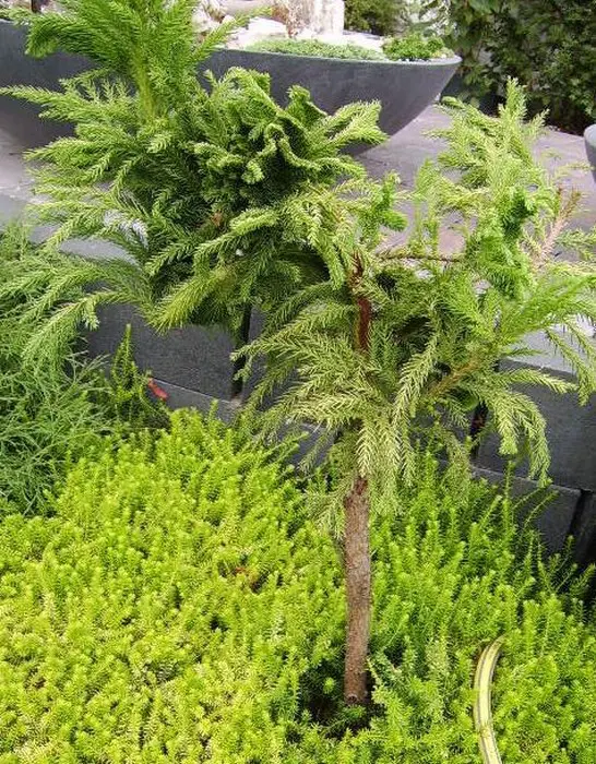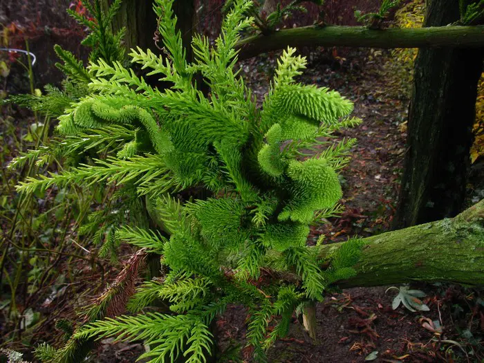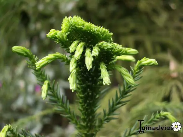 Cryptomeria japonica 'Cristata' is goed herkenbaar aan zijn hanenkamachtige verbreding aan de toppen.