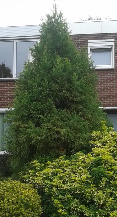 Is snelgroeiend en heeft een piramidale vorm met frisgroene naalden, in de winter verkleurend naar blauwgroen.