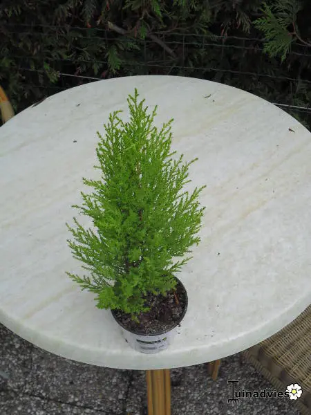 Cupressus macrocarpa 'Wilma' is een dwergconifeer met een piramidale vorm en een fel geelgroene kleur.
