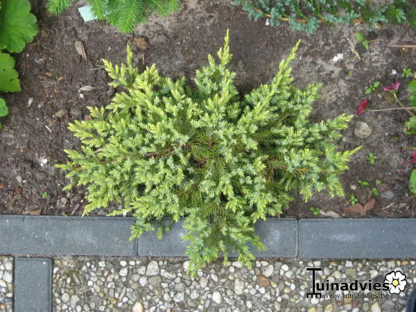 Juniperus squamata 'Dream Joy' is een breedgroeiende, blauwgroene conifeer waarvan de twijgtoppen met nieuw loof zwavelgeel kleuren.