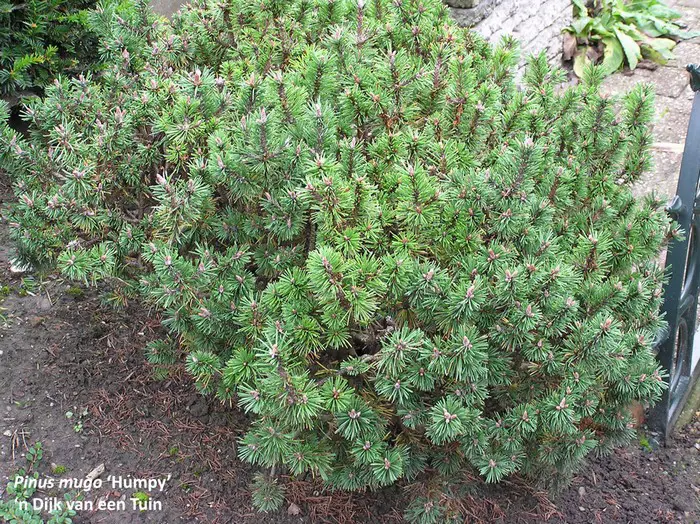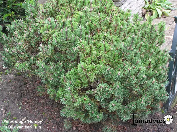 Pinus mugo 'Humpy' is een zeer traag groeiend conifeertje met een ronde vorm en met korte dichte felgroene naaldachtige bladeren.