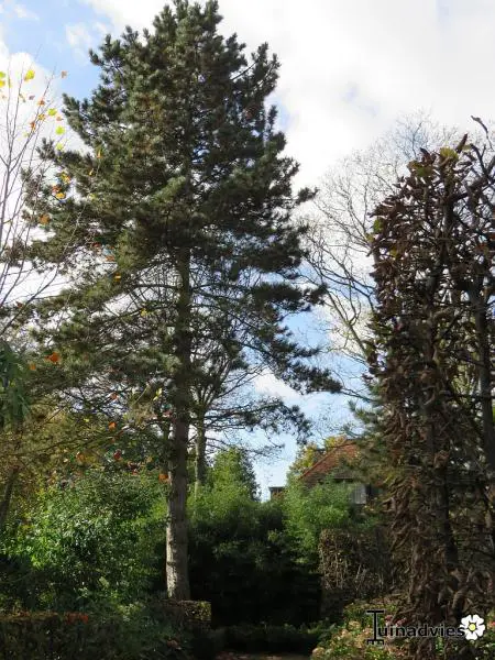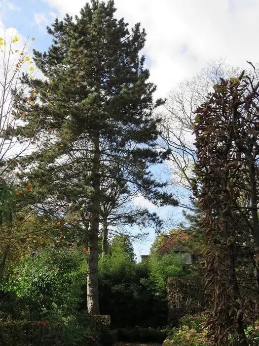 Pinus nigra subsp. nigra heeft een onregelmatige en gespreide kroon met zwartgroene naalden.
