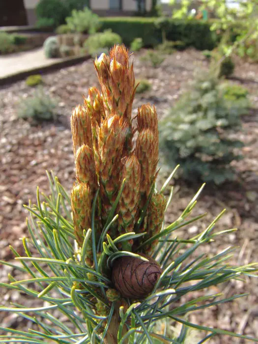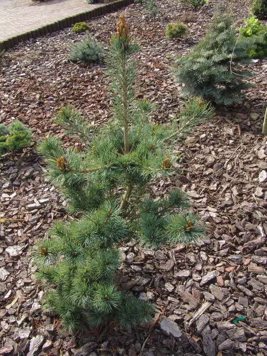 Pinus parviflora 'Fukuzumi' is een traag groeiende conifeer met een breed spreidende en onregelmatige brede vorm.De naalden zijn blauwgroen, kort en gedraaid.