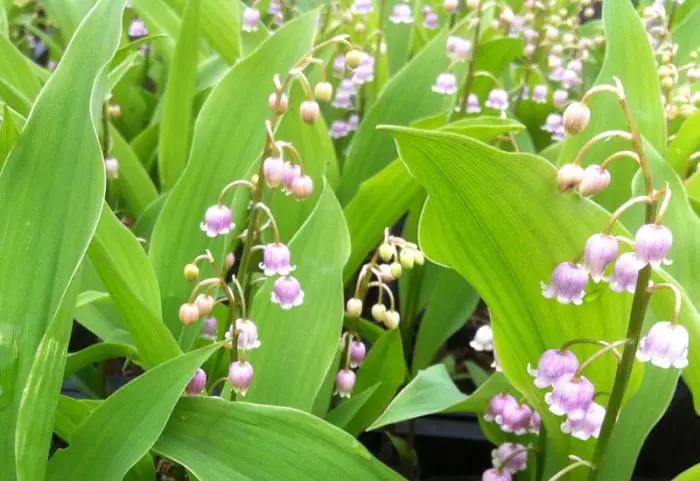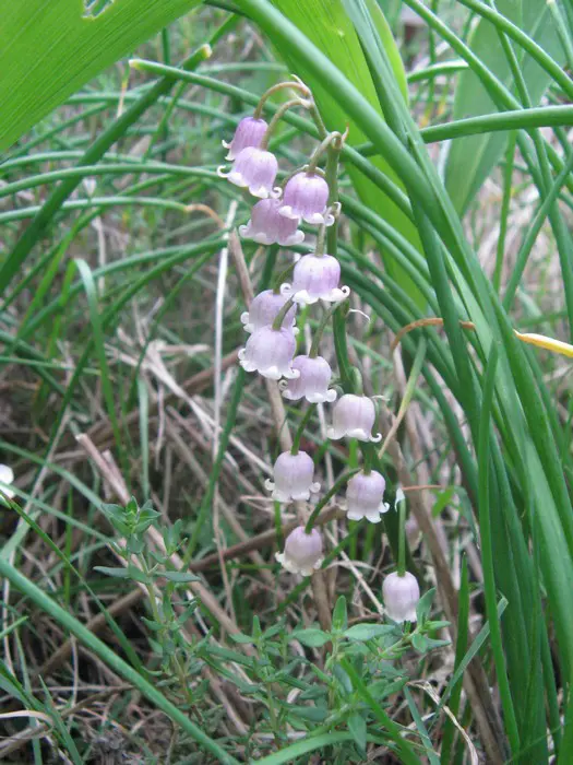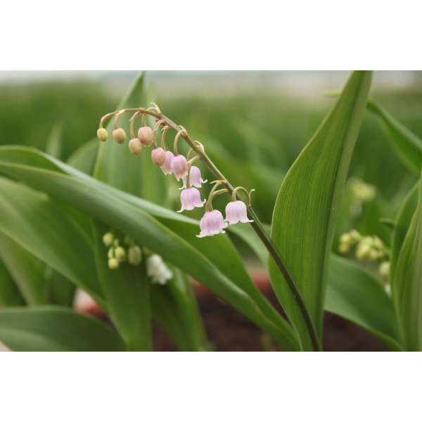 Convallaria majalis var. rosea is het welbekend Meiklokje maar dan met paarsroze klokvormige bloempjes aan gebogen stengels.