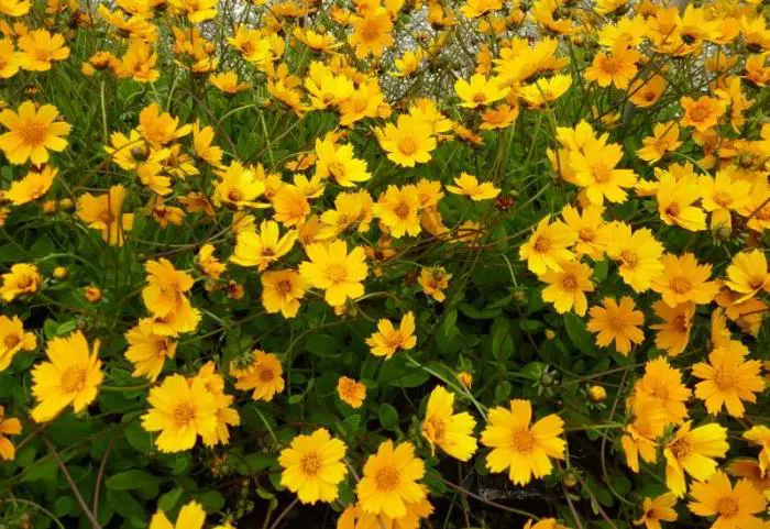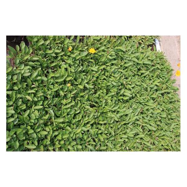 Coreopsis auriculata 'Nana' is een compact groeiende plant met leerachtige blaadjes en goudgele kleine margrietjes.
